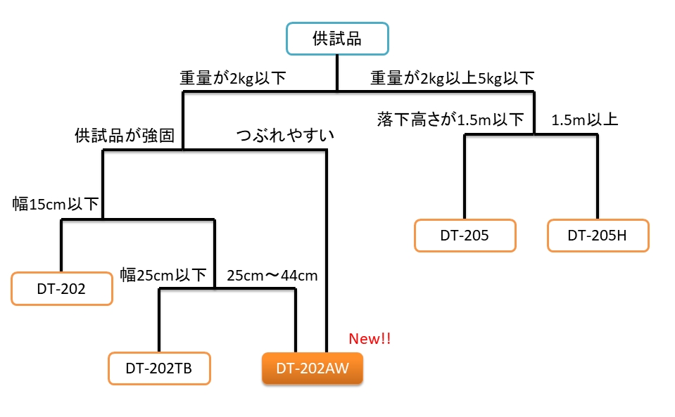 2020年11月より、軽量落下試験機 DT-202シリーズからDT-202AWが新しくラインナップに加わりました。このモデルは薄型ノートパソコンなど軽量で幅が広い製品に対して、落下試験を行うことを目的に開発されました。