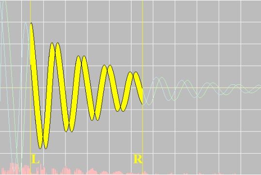 標準コイルと試験コイルの波形を規定の範囲に入れて、波形の面積の和を求めて比較し、面積の和とエネルギー損失の差を求めます。 判定値はパーセンテージで表されます。 比較した面積と演算結果が設定した判定値未満の場合は判定値とし、設定した判定値よりも大きい場合は判定値を不合格とします。