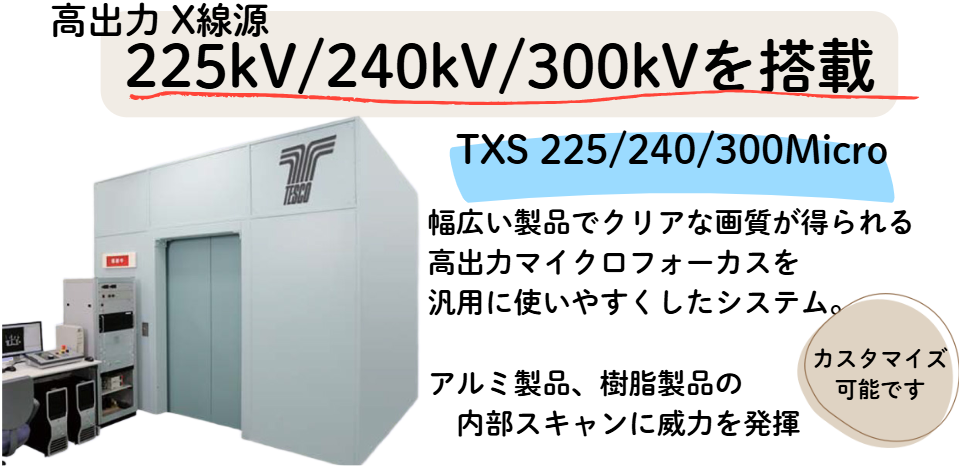 | X線装置 | 管電圧 /焦点寸法 | 300kV/300W/6μm | 240kV/240W/4μm |