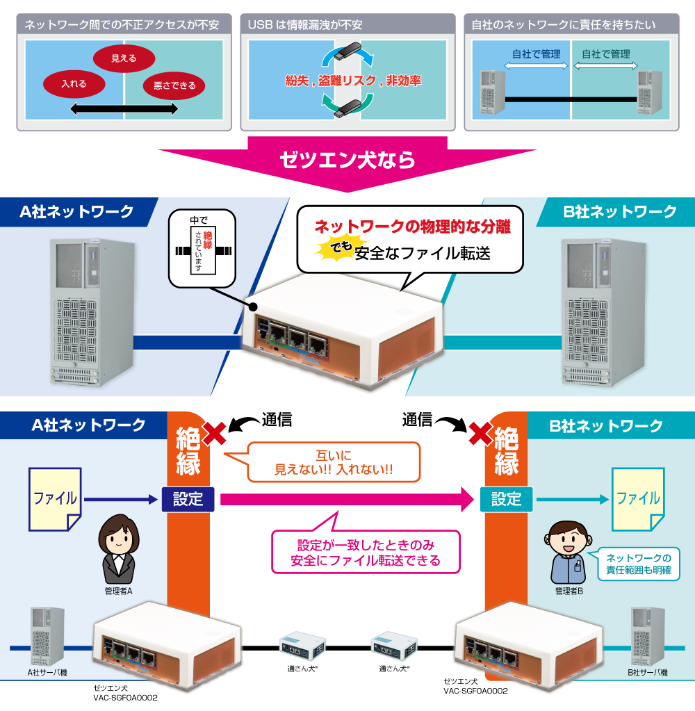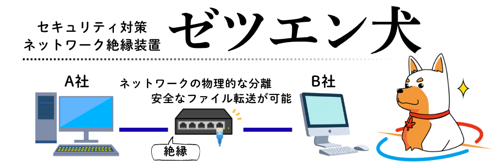 「ゼツエン犬(VAC-SGFOA0002)」は、異なる二つのネットワークを物理的に分離(絶縁)した状態を維持しながら、安全なファイル転送のみを可能にする革新的なセキュリティ装置です。